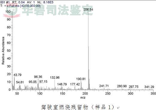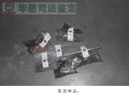 (2)取回样品:驾驶舱燃烧残留物、后窗玻璃燃烧残留物、发动机燃烧残留物、后备箱燃烧残留物各一袋;风扇电机处线束、左前灯处线束、电瓶处线束各一袋