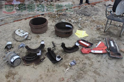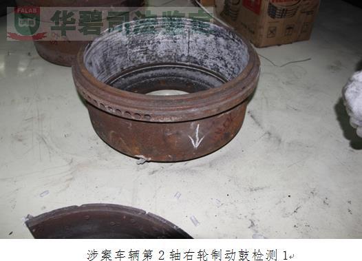 (2)取回样品:右后刹车蹄及鼓1套(第4轴);右前刹车蹄及鼓1套(第2轴);刹车总泵1个;右刹车分泵1个;大梁1截;驾驶室材料2块;车厢材料1块;仪表盘1个